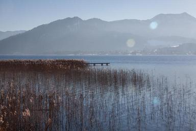Keywords: lake mountains panorama bank sky water blue rest sunny landscape nature web boardwalk winter haze reed phragmites australis grass poaceae marsh plant bluegrass