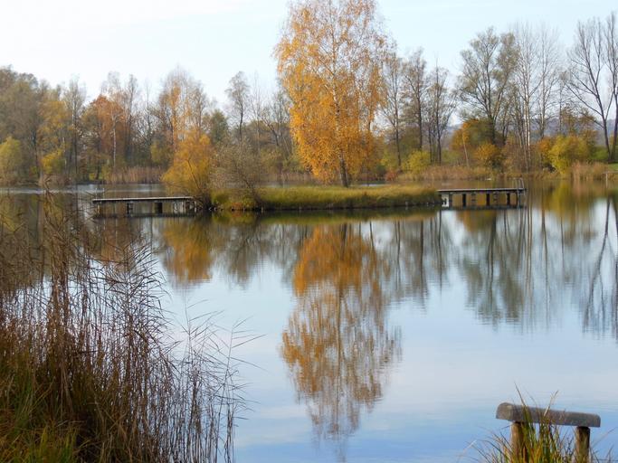 Keywords: lake sperach peracher bathing lake altötting badesee water autumn mood mirroring nature landscape trees bushes natural lake separated by comma