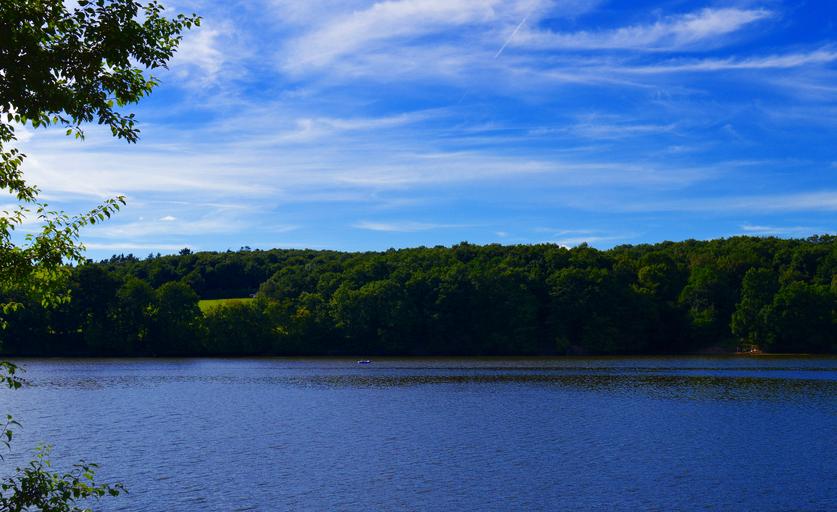 Keywords: lake water badesee dam steinbach dam bank sky trees landscape nature leisure summer fun swim boot holidays relaxation summer holiday recovery