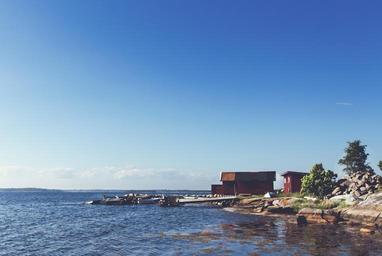 Keywords: lake water docks boats rocks sunshine sunny summer blue sky cottage shed