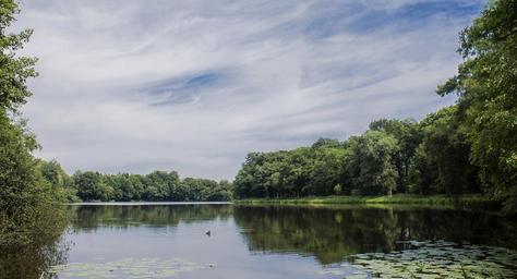 Keywords: lake water forest mirroring reflection sky clouds blue white trees