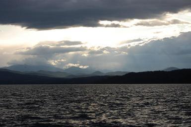 Keywords: lake waves hills windy sky clouds outdoors tranquil weather meteorology cloudscape environment nature