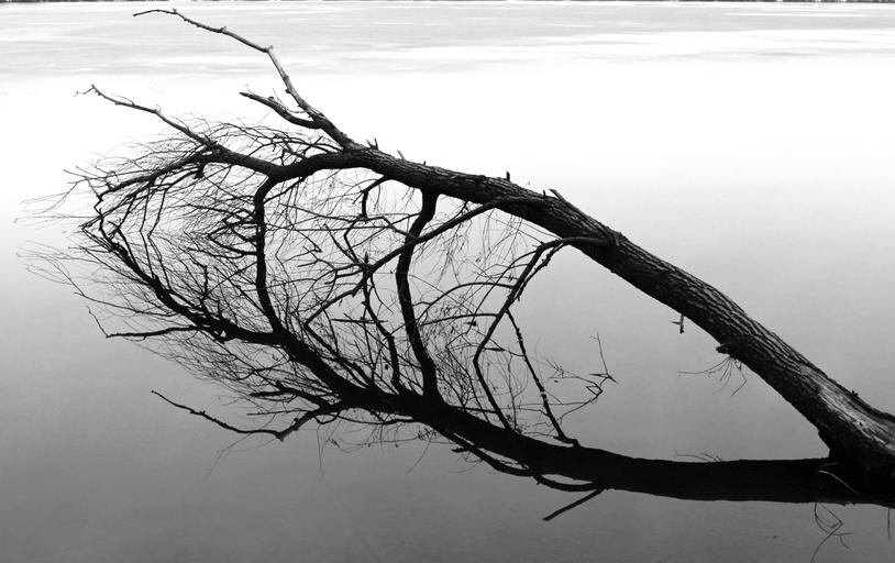 Keywords: lake winter ice mirroring frozen cold water branch clear icy waters tree wood