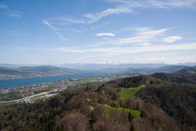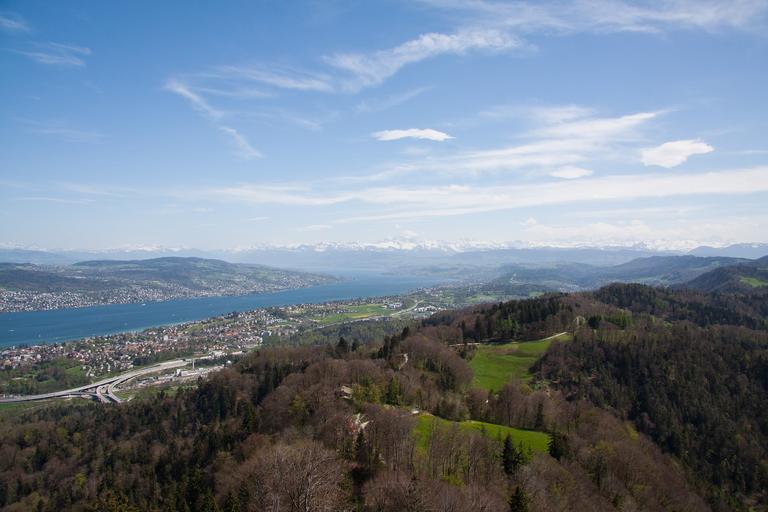 Keywords: lake zurich seen from uetliberg out switzerland alpine snowy uetliberg mountains alpenblick view landscape hiking spring meadow forest green nature trees blue