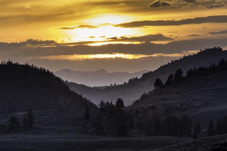 Keywords: lamar valley sunset landscape scenic twilight evening trees forest valley mountains hills outdoors yellowstone national park wyoming usa