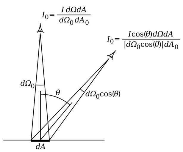 | Keywords: Lambert Cosine Law 2.svg en A diagram showing observed intensity from a Lambertian surface; units photons/ s·cm<sup>2</sup>·sr for a normal and off-normal observer; dA<sub>0</sub> is the area of the observing aperture and d is the solid angle subtended by the aperture from the viewpoint of the emitting area element Own Inductiveload 2008-11-27 Lambert's cosine law |