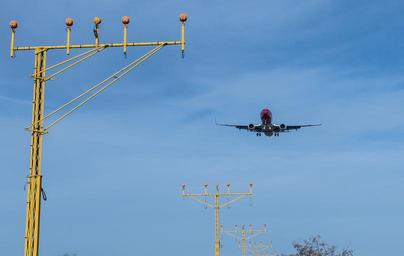 Keywords: landing land aircraft sky clouds blue fly wing aviation