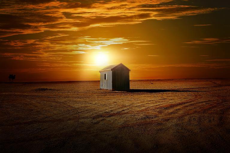 Keywords: landscape desert sand hut sunset sky sun lighting