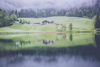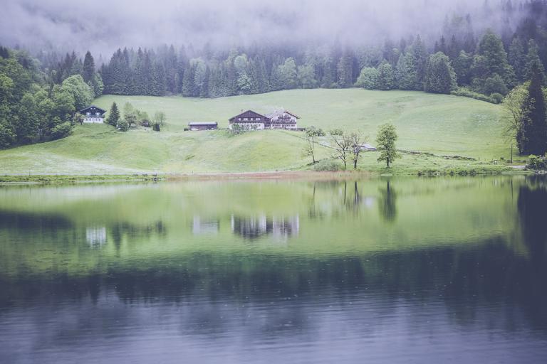 Keywords: landscape lake alpine hotel alm hut nature bank water trees natural summer fog morning dew reflection web mountain lake mountain mountains bavaria hintersee