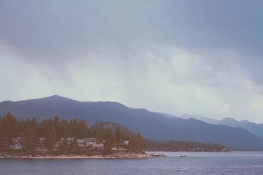 Keywords: landscape lake water houses coast mountains sky clouds