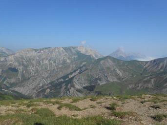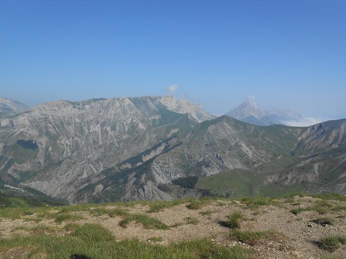 Keywords: landscape mountain hiking nature alps valley summit grass trees vegetation