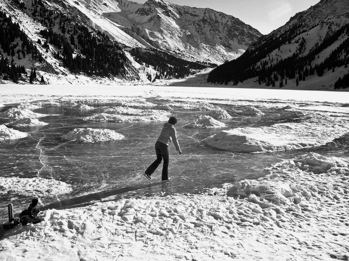 Keywords: landscape mountains lake frozen woman ice skating winter snow ice nature outside black and white