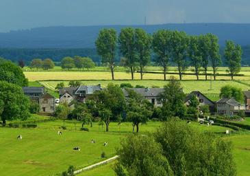 Keywords: landscape nature meadow green field lane summer wide germany trees scenic perspective village village houses cows agriculture pasture graze grass juicy grass livestock pasture trees been riding outlook