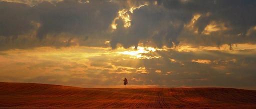 Keywords: landscape nature sunset field tree sky clouds sunlight sunbeam lighting weather mood