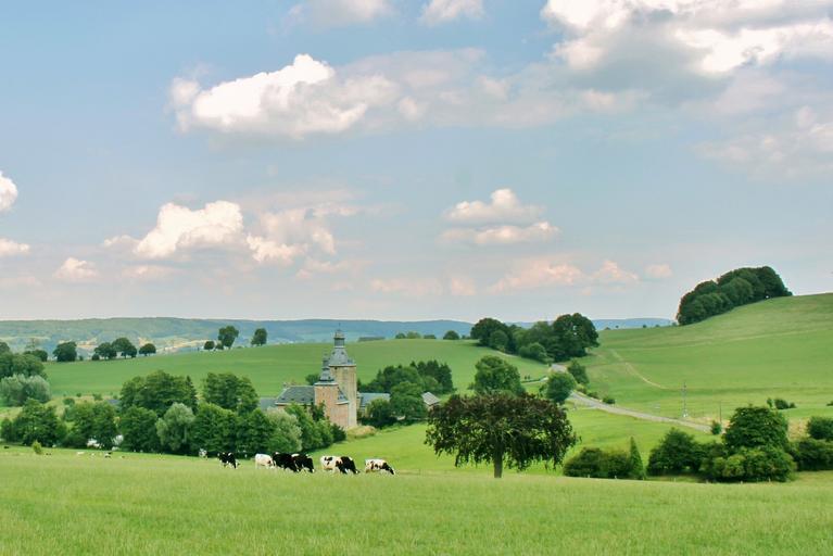 Keywords: landscape reported cows castle nature green sky clouds idyll rest relaxation graze hilly grass summer cloud formation belgium leisure holiday excursion hill vision wide outlook view hiking