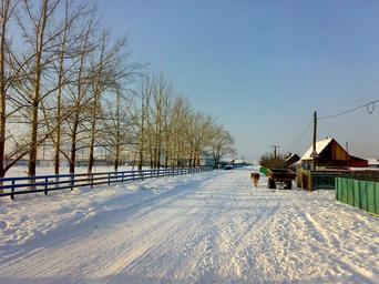 Keywords: landscape road winter snow ice sky trees horse village buildings houses architecture nature outside cart fence
