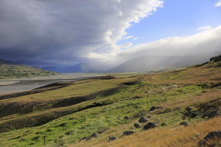 Keywords: landscape sky mountains iceland clouds view blue grass field green nature river meadow