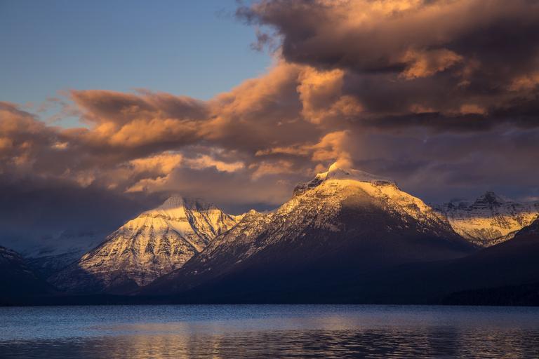 Keywords: landscape sunset mountains mount cannon mount brown lake mcdonald glacier national park montana usa twilight evening clouds light snow peaks scenic dusk reflection water