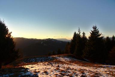 Keywords: landscape view mountains hiking snow morning sun trees golden light sunrise nature