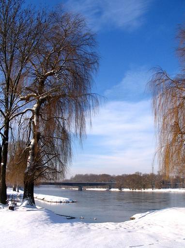 Keywords: landscape winter snow ice bridge river water shoreline sky clouds nature outside trees country countryside beautiful
