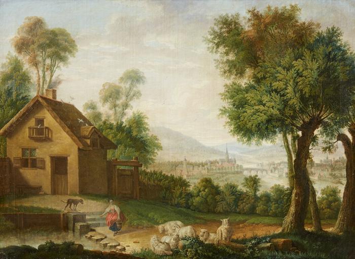 Keywords: Landschaft mit Bauernhaus und Blick auf eine Stadt am Fluss 18Jh.jpg Landschaft mit Bauernhaus und Blick auf eine Stadt am Fluss Deutscher Meister der 2 Hälfte des 18 Jahrhunderts Öl auf Leinwand 73 x 99 5 cm https //www lempertz com century 18 anonymous PD-100 Images from Kunsthaus Lempertz Landscape paintings of Germany Shepherds in art |
