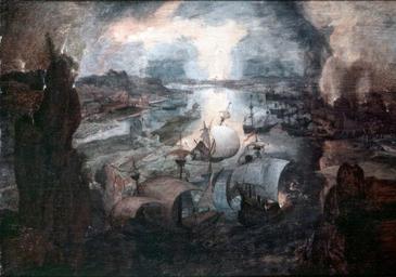 Keywords: Landschaft mit Segelschiffen und einer brennenden Stadt.jpg Artwork de Landschaft mit Segelschiffen und einer brennenden Stadt / Landschaft mit Segelschiffen und brennender Stadt ~ 1552/53 Aufnahmedatum 1956 oil on wood 24 4 x 34 8 Dortmund ehem Sammlung Becker http //www bildindex de/obj00077259 html unklar möglicherweise Pieter Bruegel der Ältere<ref>Alexander Wied Verzeichnis der Gemälde Pieter Bruegels d Ä S 155 S/W-Abbildung Nr 42 in Pieter Bruegel d Ä im Kunsthistorischen Museum Wien Hg Wilfried Seipel Skira editore Milano 2008 ISBN 978-3-85497-133-7</ref> Other versions <references/> PD-art-100 1550s paintings 16th-century sailing ships in paintings Fire in paintings Images from Bildarchiv Foto Marburg Template artwork possible 16th-century paintings location missing |