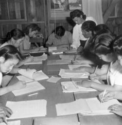 | Keywords: Lange Manzanar j8CC-802A.jpg  ;Title Manzanar Calif --Part of a class under the Adult Education Program at this War Relocation Authority center It is composed of Issei and Kibei evacuees who are studying the Ideals of American Citizenship and the English language with which they are unfamiliar At this time there are 18 such classes with an attendance of abut 20 to a class and each conducted by a volunteer instructor This is a class in penmanship with Miss Doris Nakagawa 25 as instructor She is an American citizen who finished high school in this country and attended Glendale Junior college upon her return from two years in a Woman's College in Japan -- Photographer Lange Dorothea -- Manzanar California 7/3/42 カリフォルニア州 マンザナ日系人強制収容 における成人向けの授業 アメリカ市民権や英語を知らない 世および帰米疎開 を対象にしたクラス このようなクラスは18あり 平 20人の生徒を ランティアの先生1人が教えていた 写 は25歳のドリス・ナカガワによる英語の書き方の授業 ナカガワはアメリカの高校を卒業後日 の女子短大を終えてグレンデール短大に っていたアメリカ市民である  ;Source U S Department of the Interior War Relocation Authority Photographs of Japanese-American Evacuation and Resettlement http //www archives gov National Archives ARC 538095 Record Group 210 This version from The Bancroft Library University of California Berkeley via http //content cdlib org/ark /13030/ft0h4n997z/ brand oac cdlib org PD-USGov Learning People associated with World War II People writing Photographs by Dorothea Lange of Manzanar War Relocation Center |