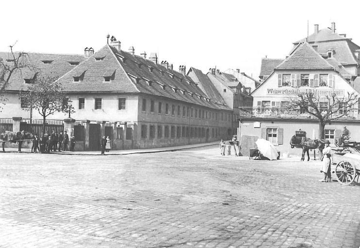 Keywords: Langgasskaserne und Weinwirtschaft Messerschmitt 1892.jpg <br>Links Die Langgaßkaserne die früher auf dem westlichen Teil des Schönleinsplatzes stand und im Auftrag des Fürstbischofs Lothar Franz von Schönborn von Leonhard Dientzenhofer errichtet wurde <br>Rechts Weinwirtschaft Messerschmitt Lange Straße 41 Elternhaus des Flugzeugpioniers Prof Willy Messerschmitt D-4-61-000-573 en historic photography of Bamberg Germany scanned from book Peter Moser Das Album des Alois Erhardt Bamberg Babenberg Verlag GmbH 2002 ISBN 3-933469-07-4 Alois Erhardt century 19 PD-old Buildings in Bamberg Alois Erhardt Schönleinsplatz Bamberg Lange Straße Bamberg Barracks in Bavaria Leonhard Dientzenhofer Wine taverns Willy Messerschmitt |