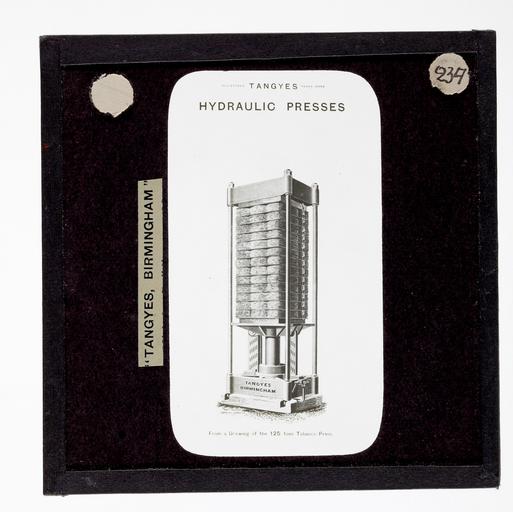 | Keywords: Lantern Slide - Tangyes Ltd, Tobacco Press, circa 1910.jpg  Tangye 130 ton multi-platen tobacco press Size mm 83 83 3 exhibition history Text printed in black ink on white adhesive paper label over black mask TANGYES BIRMINGHAM Institution Museum Victoria Lantern Slide Black White object history One of 239 glass lantern slides depicting products manufactured by Tangyes Limited engineers of Birmingham England The images include various products such as engines centrifugal pumps hydraulic pumps gas producers materials testing machines presses machine tools hydraulic jacks etc Tangyes was a company which operated from 1857 to 1957 They produced a wide variety of engineering products exported worldwide including Australia and other British colonies It is thought that this collection of magic lantern slides was used by a local agent for sales purposes These images were originally used to illustrate Tangyes Ltd product catalogues from the period 1910 - circa 1920s PD-Australia author http //collections museumvictoria com au/items/803752 Info http //collections museumvictoria com au/content/media/30/434980-original jpg Image Uploaded with GWToolset Lantern Slide - Tangyes Ltd Tobacco Press circa 1910 http //collections museumvictoria com au/content/media/30/434980-original jpg Tangyes Lantern Slide Collection Hydraulic presses Tobacco |