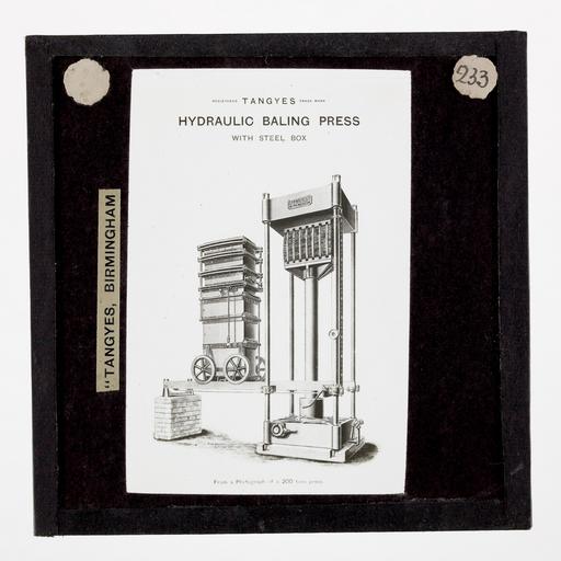 Keywords: Lantern Slide - Tangyes Ltd, Baling Press, circa 1910.jpg Tangye's hydraulic baling press with steel box on rails Size mm 83 83 3 exhibition history Text printed in black ink on white adhesive paper label over black mask TANGYES BIRMINGHAM Institution Museum Victoria Lantern Slide Black White object history One of 239 glass lantern slides depicting products manufactured by Tangyes Limited engineers of Birmingham England The images include various products such as engines centrifugal pumps hydraulic pumps gas producers materials testing machines presses machine tools hydraulic jacks etc Tangyes was a company which operated from 1857 to 1957 They produced a wide variety of engineering products exported worldwide including Australia and other British colonies It is thought that this collection of magic lantern slides was used by a local agent for sales purposes These images were originally used to illustrate Tangyes Ltd product catalogues from the period 1910 - circa 1920s PD-Australia author http //collections museumvictoria com au/items/803551 Info http //collections museumvictoria com au/content/media/40/434990-original jpg Image Uploaded with GWToolset Lantern Slide - Tangyes Ltd Baling Press circa 1910 http //collections museumvictoria com au/content/media/40/434990-original jpg Tangyes Lantern Slide Collection Hydraulic presses |