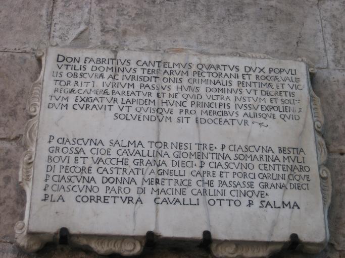 Keywords: Lapide Taverna Popoli.jpg Popoli it wikipedia 2008-11-01 Claro48 wikipedia it Claro48 Original upload log it wikipedia Lapide_Taverna_Popoli jpg wikitable - 2008-11-01 20 27 2592×1944× 1217040 bytes Claro48 <nowiki>Autore My own production free use Descrizione Lapide posta sulla facciata esterna della taverna del XIV secolo a Popoli in provincia di Pescara in Abruzzo Italy Nella stessa vengono riportati i compensi da corrsispondere al momento del transito p</nowiki> Plaques in Popoli Latin inscriptions in Abruzzo Taverna Ducale dei Cantelmo Popoli |