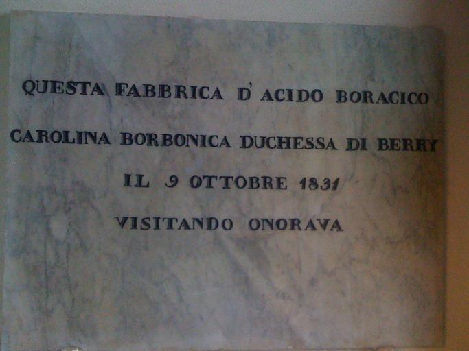 Keywords: Larderello Duchessa di Berry.JPG Duchessa di Berry agli stabilimenti di Larderello own Mmm448 2010-08 Larderello Princess Caroline of Naples and Sicily Plaques referencing 1831 Plaques in Tuscany Larderello 9 October 1831