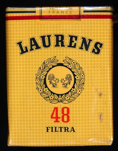 Keywords: Laurens cigarettes pack, front.JPG Very old packaging of a product that is not produced and not sold any more own 2014-04-13 10 46 08 Alf van Beem CC-Zero Trademarked Laurens cigarettes Cigarette packs