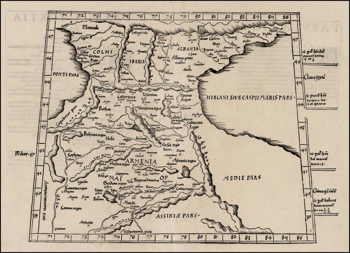 Keywords: Laurent Fries. Tabula Tertia Asiae (Armenia and Caspian Region). 1522.jpg en Laurent Fries Tabula Tertia Asiae Armenia and Caspian Region <br /> Marvelous map of Armenia and the regions between the Balck Sea Caspian Sea and the Caucus Mountains One of the earliest obtainable maps of the region and one of the most strikingly engraved Latin Text on the verso describes the map https //www raremaps com/gallery/detail/4704/Tabula_Tertia_Asiae_Armenia_and_Caspian_Region/Fries html Barry Lawrence Ruderman Antique Maps Inc Lyon / 1522 Laurent Fries PD-Art-100 1522 maps Laurent Fries Old maps of the Caucasus 16th-century maps of Georgia 16th-century maps of Azerbaijan Maps of Colchis Maps of the Kingdom of Iberia Old maps of Caucasian Albania Ptolemaic Caucasus region Claudii Ptolemaei Alexandrini Geographicae Enarrationis Libri Octo |