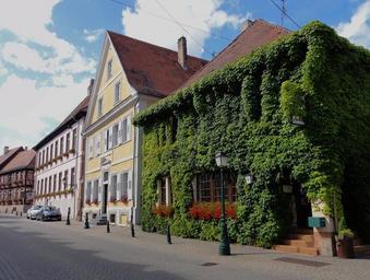 Keywords: lauterbourg france town buildings architecture sky clouds plants flowers ivy vines growth outside street