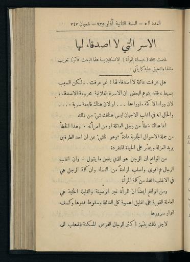| Keywords: Layla, Issue 5, March 1925 WDL2865.jpg Artwork ru Хассун Паулина fr Hassoun Paulina en Hassoun Paulina zh 哈桑 琳 pt Hassoun Paulina ar حسون بولينا es Hassoun Paulina ru Лейла выпуск 5 ма т 1925 г fr Layla numéro 5 mars 1925 en Layla Issue 5 March 1925 zh Layla ,第 5 ,1925 年 3 pt Layla Edição 5 março de 1925 ar ليلى، العدد 5، آذار 1925 ru <i> Лейла </i> был пе вым женским жу налом опубликованным в И аке Этот жу нал впе вые выпущенный в 1923 году был посвящен новейшим полезным воп осам связанным с наукой искусством лите ату ой социологией и в частности воспитанию и обучению девочек здо овью семьи и д угим воп осам касающимся ведения домашнего хозяйства После установления национального п авительства в И аке появилось несколько жу налов и газет посвященных женским воп осам <i> Лейла </i>ознаменовал собой за ождение женской п ессы в И аке этот жу нал считается одним из факто ов повлиявших на возникновение и фо ми ование а абского женского движения Жу нал выпускался под девизом а пути к воз ождению и акской женщины и асп ост анял новости культу ы об азования и воп осов касающихся семьи а также возглавлял кампанию за освобождение женщин В числе его азделов были следующие Испытание п авом алоговые новости Уголок домохозяйки Забавные новости Кольца магических ст ок и д угие В жу нале также освещались воп осы касающиеся исследований в области медицины лите ату ы и поэзии и были опубликованы п оизведения известных и акских поэтов аль-Расафи и аль-Захави Одной из наиболее значимых статей опубликованных в жу нале была статья вышедшая в Выпуске 6 от 15 мая 1924 года об ащенная к Уч едительному соб анию И ака с п изывом п едоставить женщинам их законные п ава Всего было выпущено <i> </i>20 выпусков жу нала Лейла В последнем выпуске от 15 августа 1925 года соде жалась печальная статья в кото ой читателям жу нала объяснялось сложное финансовое положение жу нала Вско е после этого владелица жу нала Паулина Хассун покинула И ак и жу нал п ек атил свое существование <br>Жу налы для женщин fr <i>Layla</i> a été le premier magazine féminin publié en Irak Lancée en 1923 la revue traitait de sujets nouveaux et utiles dans des domaines aussi variés que la science l'art la littérature la sociologie mais aussi l'éducation des enfants et des jeunes filles la santé familiale et d'autres sujets relevant de l'économie domestique L'établissement d'un régime républicain en Irak a été suivi par l'apparition de plusieurs journaux et magazines traitant de problématiques féminines <i> Layla </i>a marqué les débuts de la presse féminine en Irak et le magazine est considéré comme un des facteurs de l'émergence du mouvement des femmes arabes Publié sous le bandeau Sur la voie de la renaissance de la femme irakienne le magazine diffusait des informations à propos de culture d'éducation et de la famille et a également pris la tête d'une campagne de libération de la femme Ses éditoriaux avaient pour titre Le creuset du Droit Actualités fiscales Le coin des femmes au foyer Informations insolites Anneaux de cordes magiques etc Le magazine s'intéressait également à la recherche médicale à la littérature et à la poésie et a publié des oeuvres des célèbres poètes irakiens al-Rasafi et al-Zahawi L'un des plus importants articles parus dans le magazine a été l'éditorial du numéro 6 datant du 15 mai 1924 adressé à l'Assemblée constituante irakienne et lui demandant d'accorder leurs droits aux femmes Layla<i> </i>n'a connu que 20 parutions Son dernier numéro daté du 15 août 1925 comprend un article au ton triste expliquant aux lecteurs la situation financière difficile du magazine Peu de temps après la propriétaire Paulina Hassoun a quitté l'Irak et la revue a cessé de paraître <br>Périodiques féminins en <i>Layla</i> was the first women's magazine to be published in Iraq Launched in 1923 the magazine dealt with new and useful matters related to science art literature sociology and in particular to child-rearing and the education of girls family health and other matters pertaining to home economics The establishment of national rule in Iraq was followed by the emergence of several magazines and newspapers dealing with women's issues <i>Layla</i> marked the beginnings of the women's press in Iraq and the magazine is credited with being one of the factors in the emergence of the Arab women s movement Published under the banner On the Way to Revival of the Iraqi Woman the magazine disseminated news about culture education and family affairs as well as led a campaign for the liberation of women Its ed