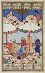 | Keywords: Layla and Majnun2 without color profile.jpg Layla and Majnun described in the third book of Nizami's Khamsah Quintet Forcibly separated by their respective tribes' animosity forced marriage and years of exile into the wilderness these two ill-fated lovers meet again for the last time before their deaths thanks to the intervention of Majnun's elderly messenger Upon seeing each other in a palm-grove immediately outside of Laylah's camp they faint of extreme passion and pain The old man attempts to revive the lovers while the wild animals protective of Majnun The King of Wilderness attack unwanted intruders <br> The location and time of the narrative is hinted at by the two tents dressed in the middleground and the dark nighttime sky in the background The composition's style and hues are typical of paintings made in the city of Shiraz during the second half of the 16th century Many manuscripts at this time were produced for the domestic market and international export rather than by royal commission <br> This particular painting appears to have been executed at the same time as the text of the Khamsah proper which survives on the painting's verso <br> Script nasta'liq<br> Dimensions of Painting Recto 12 2 w x 16 7 h cm<br> Dimensions of Written Surface 12 2 w x 20 9 h cm<br> Majnoun et Leila issue du troisième livre de Khamsah « Quintette » du poète persan Nizami Séparés par la rivalité entre leurs deux familles un mariage forcé et des années d'exil dans la nature se rencontrent une derniere fois avant leur mort grâce à l'action du vieux messager de Majnoun à la vue l'un de l'autre dans la palmeraie la nuit ils s'evanouissent de passion et de tristesse Le vieil homme tente de les réveiller tandis que vles animaux sauvages protègent Mahjoun « Roi de la nature » contre les intrus <br> Le temps et le lieu sont indiqués par les deux tentes au second plan et le ciel étoilé en arrière plan Le style et les couleurs utilisées sont typiques du style développé à Chiraz durant la seconde moitié du XVI<sup>e</sup> siècle Beaucoup de manuscrits on été crées a l'époque pour le marché local et l'export <br> Dimensions de l'enluminure 12 2 x 16 7 cm<br> Dimensions de la page hors marges 12 2 x 20 9 cm<br> Layla_and_Majnun2 jpg 2010-03-29 10 26 UTC Layla_and_Majnun2 jpg author Removed embedded color profile that is not supported by firefox Layla_and_Majnun2 jpg PD-art original upload log This image is a derivative work of the following images File Layla_and_Majnun2 jpg licensed with PD-Art PD-old 2009-01-20T05 57 47Z Durova 1617x2616 3821631 Bytes <nowiki> The fainting of Laylah and Majnun This folio depicts a well-known passage from the tragic story of Laylah and Majnun described in the third book of Nizami's Khamsah Quintet Forcibly separate</nowiki> Uploaded with derivativeFX Library of Congress Arabic Persian and Ottoman calligraphy collection Persian miniatures Leyli and Majnun Nizami Ganjavi |