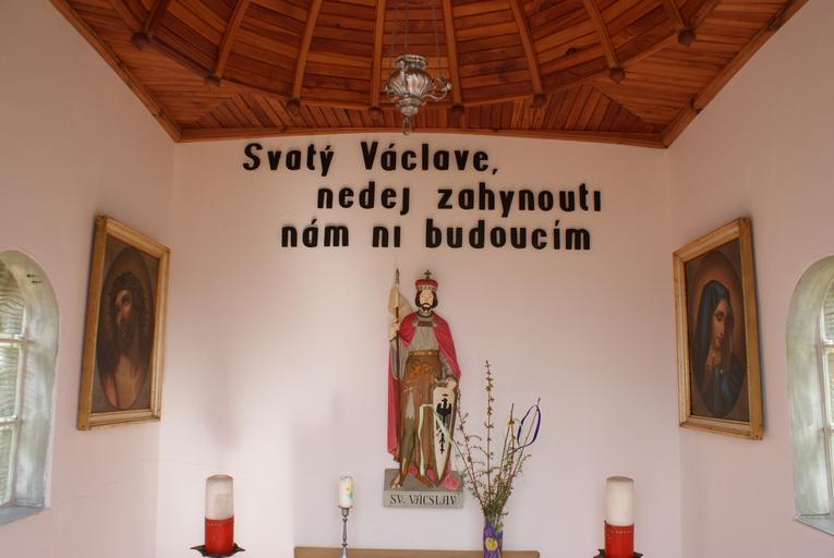 | Keywords: Lazsko memorial chapel interior.JPG en Lazsko a village in Příbram district Czech Republic Interior of the memorial chapel above the village cs Lazsko okres Příbram interiér pamětní kapličky nad vsí own Feťour 2010-04-11 Memorial chapel in Lazsko Statues of Saint Wenceslaus in Central Bohemian Region |