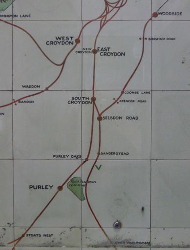 | Keywords: LB and SCRly map 204.jpg 300px right Part of a map of the suburban lines of the London Brighton and South Coast Railway made in ceramic tiles and on display at Victoria Station It dates from after 1905 because Bandon Halt station opened in 1906 and from before 1911 because it shows http //www subbrit org uk/sb-sites/stations/c/coulsdon_north/index shtml Stoats Nest station which was renamed in that year At the centre of the image on the right is a station entrance Go in there and look to your left You will see a ceramic map of the whole of the LB SCR network A few steps further on and also on the left is this map Some of you have walked past it many times and never seen it The http //rhaworth ucoz net/tq/th/072203 jpg map key describes Bingham Road Spencer Road and Bandon as motor halts The green 'V' below Sanderstead marks a golf club presumably Purley Downs GC The silver object near the bottom is the head of a screw which is holding a protective perspex sheet in place PD-Art but for the ruling cited above I would licence this as my own work with Roger W Haworth's licence Signs in London Victoria station Rail transport maps of the United Kingdom Maps of the London Borough of Croydon Rail transport in the London Borough of Croydon Ceramics in the City of Westminster Artworks missing infobox template |