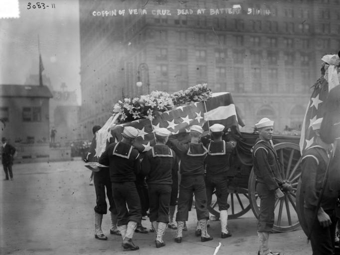| Keywords: blackandwhite monochrome black and white LC-DIG-GGBAIN-16189: Intervention at Veracruz, Mexico, 1914. Photograph shows sailors putting a flag draped casket on a caisson in New York City, before the National Memorial Service on May 11, 1914 in honor of the seamen and marines who were killed in Veracruz, Mexico during the Mexican Revolution. . Courtesy of the Library of Congress. (5/8/2015). LC-DIG-GGBAIN-16189: Intervention at Veracruz, Mexico, 1914. Photograph shows sailors putting a flag draped casket on a caisson in New York City, before the National Memorial Service on May 11, 1914 in honor of the seamen and marines who were killed in Veracruz, Mexico during the Mexican Revolution. . Courtesy of the Library of Congress. (5/8/2015). |