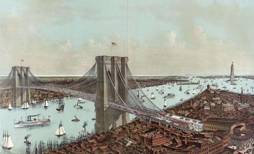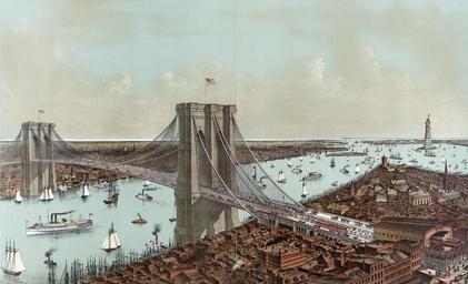 Keywords: outdoor LC-DIG-PPMSCA-08971: Bird’s Eye View of the Great East River. Print shows a bird's-eye view of the Brooklyn Bridge spanning the East River, with ships on the river and traffic on the bridge; also shows, from left, the "Brooklyn Tower, Fulton Ferry, Brooklyn, Atlantic Ocean (in the distance), New York Tower, Coney Island, Highlands of Navesink (in the distance), Governors Island, New York Cotton Exchange, Produce Exchance, Staten Island, Mutual Life Ins. Building, Statue of Liberty on Bedloes Island, Trinity Church, Equitable Life Assurance Building, [and the] New York Entrance" to the bridge. Lithograph by Currier & Ives, circa 1892. (6/12/2015). LC-DIG-PPMSCA-08971: Bird’s Eye View of the Great East River. Print shows a bird's-eye view of the Brooklyn Bridge spanning the East River, with ships on the river and traffic on the bridge; also shows, from left, the "Brooklyn Tower, Fulton Ferry, Brooklyn, Atlantic Ocean (in the distance), New York Tower, Coney Island, Highlands of Navesink (in the distance), Governors Island, New York Cotton Exchange, Produce Exchance, Staten Island, Mutual Life Ins. Building, Statue of Liberty on Bedloes Island, Trinity Church, Equitable Life Assurance Building, [and the] New York Entrance" to the bridge. Lithograph by Currier & Ives, circa 1892. (6/12/2015).