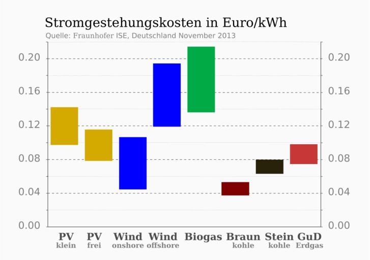 | Keywords: LCOE stromgestehungskosten vergleich fraunhofer november 2013.svg de Stromgestehungskosten - Levelized Cost Of Electricity LCOE Ein Vergleich der Stromgestehungskosten für verschiedene erneuerbare Energien und konventionelle Kraftwerke in Deutschland im Jahr 2013 Für Photovoltaik PV wurde eine jährliche solare Einstrahlung GHI - Global Horizontal Irradiation in Kilowattstunden pro Quadratmeter und bei den anderen Technologien eine jährliche Volllaststundenanzahl FLH - Full Load Hours der Anlage angenommen Es wurden jeweils minimale und maximale Werte zu den Investitionskosten verwendet d4aa00 1px solid A38300 PV system - klein jährliche GHI von 1000 ”1200 kWh/m² d4aa00 1px solid d4aa00 PV system - frei jährliche GHI von 1000 ”1200 kWh/m² 0000ff 1px solid 0000CC Wind power - onshore jährliche FLH von 1300 ”2700 Stunden 0000ff 1px solid 0000ff Wind power - offshore jährliche FLH von 2800 ”4000 Stunden 00aa44 1px solid 00752F Biogas jährliche FLH von 6000 ”8000 Stunden 800000 1px solid 4D0000 Braunkohle jährliche FLH von 6600 ”7600 Stunden 28220b 1px solid 000000 Steinkohle jährliche FLH von 5500 ”6500 Stunden c83737 1px solid A02C2C GuD - Erdgas jährliche FLH von 3000 ”4000 Stunden 2014-07-19 23 45 00 own based on http //www ise fraunhofer de/de/veroeffentlichungen/veroeffentlichungen-pdf-dateien/studien-und-konzeptpapiere/studie-stromgestehungskosten-erneuerbare-energien pdf Stromgestehungskosten ”Erneuerbare Energien Eine Studie des http //www ise fraunhofer de/de/ Fraunhofer ISE Deutschland Version November 2013 Seite 2 http //www webcitation org/6RZjrf7sJ archiviert PDF http //www ise fraunhofer de/en/publications/veroeffentlichungen-pdf-dateien-en/studien-und-konzeptpapiere/study-levelized-cost-of-electricity-renewable-energies pdf english version p 4 http //www webcitation org/6RYpyglEn archived PDF Valid SVG margin 5px 0; inkscape Rfassbind thumb left English version Renewable energy schemas and diagrams |