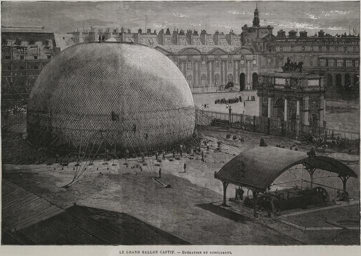 Keywords: Le grand ballon captif. Opération du gonflement.jpg Installation of the hot air balloon at the 1878 Paris World Fair Giffard who was at the origin of the project was a French engineer who created a few models of balloons and who also managed to create navigable ones The 1878 hot air balloon was located in the Tuileries For a fee visitors could enter its gondola and admire the view of the city The balloon could go up to about half a mile 1878 engraving 20 5 x 30 5 cm Institution Brown University Library object history exhibition history credit line Bitard Adolphe L' Exposition de Paris 1878 Rédigée par A Bitard avec la collaboration d'écrivains spéciaux Paris Librairie illustrée; Librairie M Dreyfous 1878 accession number 1254167453195254 PD-old Engravings of Paris Images of Paris from the Brown University Library Grand balloon ascents by Henri Giffard 1878 engravings Historical images of Arc de Triomphe du Carrousel Arc de Triomphe du Carrousel from the west Remote views of Arc de Triomphe du Carrousel |