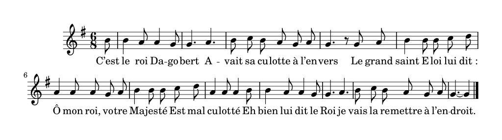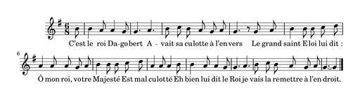 MAKE A MEME View Large Image Le Roi Dagobert.svg Le Roi Dagobert fr LilyPond source <source lang text > \version 2 14 0 \header tagline f \score \relative c \key g \major \time 6/8 \partial 8 \autoBeamOff b8 b4 a8 a4 g8 g4 a b8 c b a g a g4 r8 g a b4 b8 b c d a4 a8 a g ...