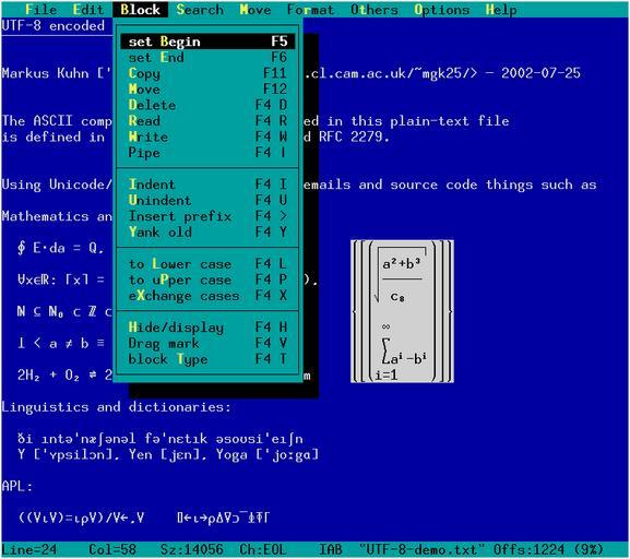 | Keywords: Le-utf-Rblock.png en LE editor screenshot with an UTF-8 example text and a rectangular block selected own screenshot Alexander Lukyanov 2008-08-19 Check categories 2008 November 19 en wikipedia LE_ text_editor Software Screenshots of free software Text user interface C++ |