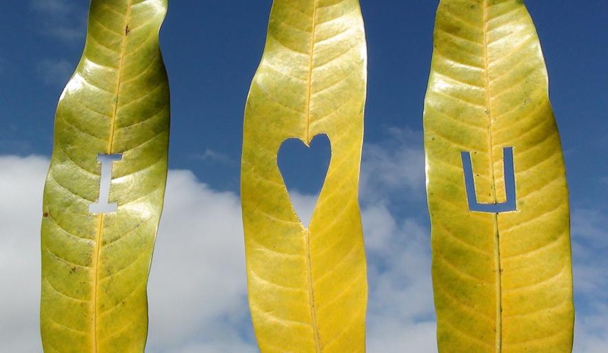 Keywords: leaves i love you leaf love romantic valentine decoration design nature sky clouds green natural pattern environment letters sign outside heart sunny outdoors texture day light blue white backdrop