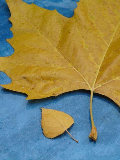 Keywords: leaves size comparison leaf leaf veins stalk rain wet maple leaf yellow fall color poplar leaf black poplar leaf autumn fall foliage