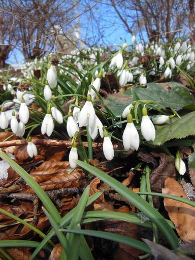 Keywords: leaves snowdrops spring sunshine blue sky plants flowers bulbs natural white green blue close-up harbingers of spring slope