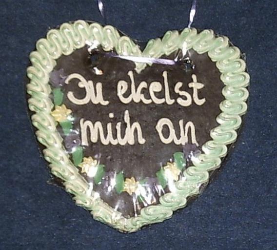 Keywords: Lebkuchenherz.jpg Ein Lebkuchenherz von der Kirmes A Lebkuchenherz note The words in icing Du ekelst mich an meaning You disgust me This is a mean joke since Lebkuchen usually come with a nice message such as I love you etc own 2006-01-29 User Schlonz Gingerbread hearts Gingerbread of Germany |