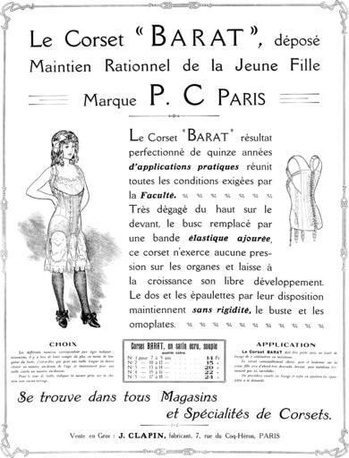 | Keywords: LeCorsetBARATdeposeMaintienRationnol.png fr Le Corset «BARAT» déposé Maintien Rationnel de la Jeune Fille<br>Marque P C PARIS<br>Le Corset «BARAT» résultat perfectionné de quinze années <i><b>d'applications pratiques</b></i> réunit tu toutes les conditions exigées par la <i><b>Faculté </b></i><br>Très dégagé du haut sur le devant le busc remplacé par une bande <b><i>élastique ajourée</i></b> ce corset n'exerce aucune pression sur les organes et laisse à la croissance son libre développement Le dos et les épaulettes par leur disposition maintiennent <b><i>sans rigidité</i></b> le buste et les omoplates <br>CHOIX<br><I>Les différents numéros correspondent aux âges indiqués néanmoins il y a lieu de tenir compte du plus ou moins de longueur du buste c'est-à -dire que pour une taille longue on devra choisir un numéro au-dessus de l ™Ã¢ge et inversement pour une taille courte un numéro au-dessus <br>Pour le tour de taille indiquer la mesure prise sur la chemise sans aucun serrage </I><br>Corset BARAT en satin écru souple<br>qualité extra <br>N° 1 pour 7 à 9 ans 14 Fr<br>N° 2 pour 10 à 12 ” 15 »<br>N° 3 pour 13 à 14 ” 20 »<br>N° 4 pour 15 à 16 ” 22 »<br>N° 5 pour 17 à 18 ” 24 »<br>APPLICATION<br><b>Le Corset BARAT</b> <I>doit être porté avec un écart de laçage de 2 centimètres au maximum <br>Le corset convenablement choisi posé et boutonné sur la jeune fille sera d'abord très descendu devant puis maintenu fermement par les jarretelles <br>On procédera ensuite au laçage et enfin on ajustera les épaulettes à la demande </I><br>Se trouve dans tous Magasins et spécialités de Corsets <br>Vente en Gros J CLAPIN fabricant 7 rue du Coq-Héron PARIS en The Corset «BARAT» an effective support for a young girl <br>trademark P C PARIS<br>The corset Barat is the perfected result of fifteen years of practical experience and it meets all the conditions required by the faculty <br>BARAT corset satin off-white soft extra quality da Korsettet Barat en effektiv støtte for en ung pige <br>varemærke P C PARIS<br>Korsettet Barat er det perfektionerede resultatet af femten Ã¥rs praktiske erfaringer og det opfylder alle de betingelser der kræves af fakultetet <br> BARAT korset satin off-white blød ekstra kvalitet <br>Nr 1 for 7 til 9 Ã¥r 14 Fr <br>Nr 2 for 10 til 12 ” 15 » <br>Nr 3 for 13 til 14 ” 20 » <br>Nr 4 for 15 til 16 ” 22 » <br>Nr 5 for 17 til 18 ” 24 » a French journal Illustré anonymus 1911 PD File LeCorsetBARATdepose png PD-Art Corset advertisements Girls in corset 1911 advertisements Fashion in 1911 |